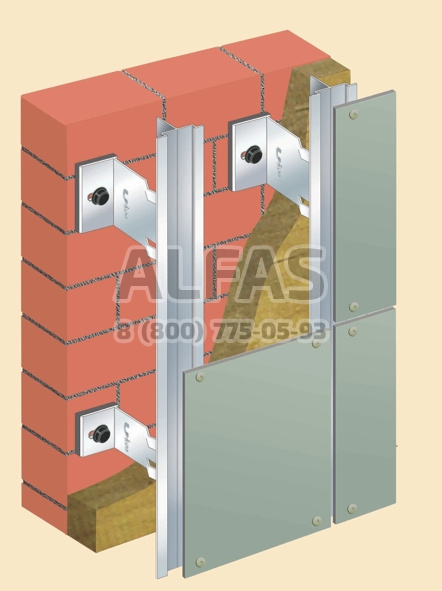 Система предназначена для крепления облицовки выполненной из плоских листовых материалов, применяемых для облицовки фасадов.